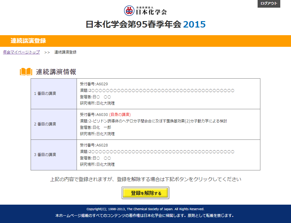 また、既に連続講演登録されている講演とは別の講演と連続講演を希望する場合や、連続講演を追加する場合は、一旦解除を行ってから再度連続講演登録を行って下さい。