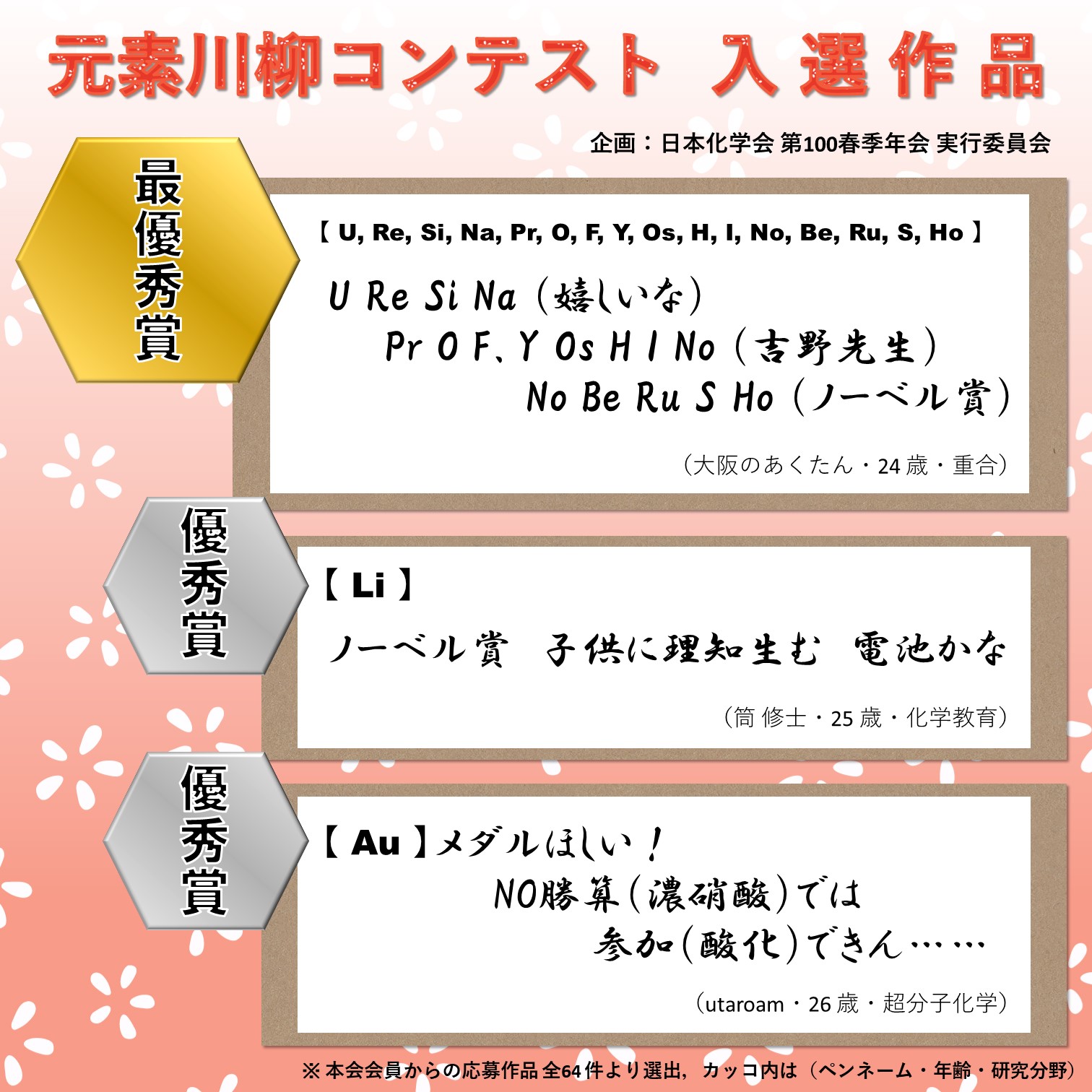 第100春季年会実行委員会は、参加者の皆様に「元素という切り口から、化学により親しみを感じていただきたい」との思いから、元素川柳コンテストを開催いたします。