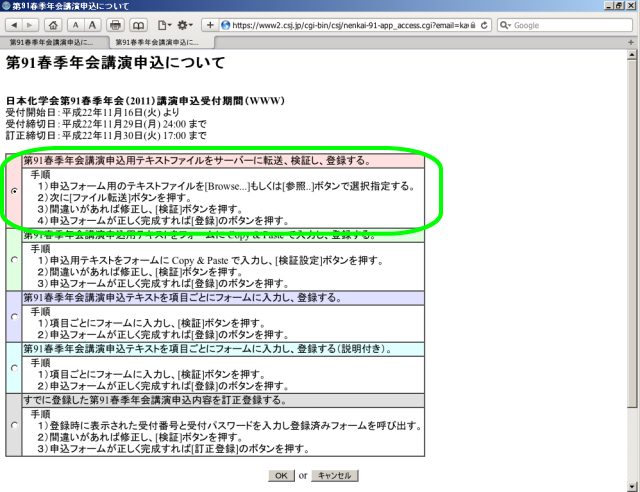 - 2で入力したメールアドレス宛に届くメールの本文に記載のURLをクリックすると、下記の画面が表示されますので、「第91春季年会講演申込用テキストファイルをサーバーに転送、検証し、登録する。」にチェックが入っている事を確認して、OKボタンを押して下さい。