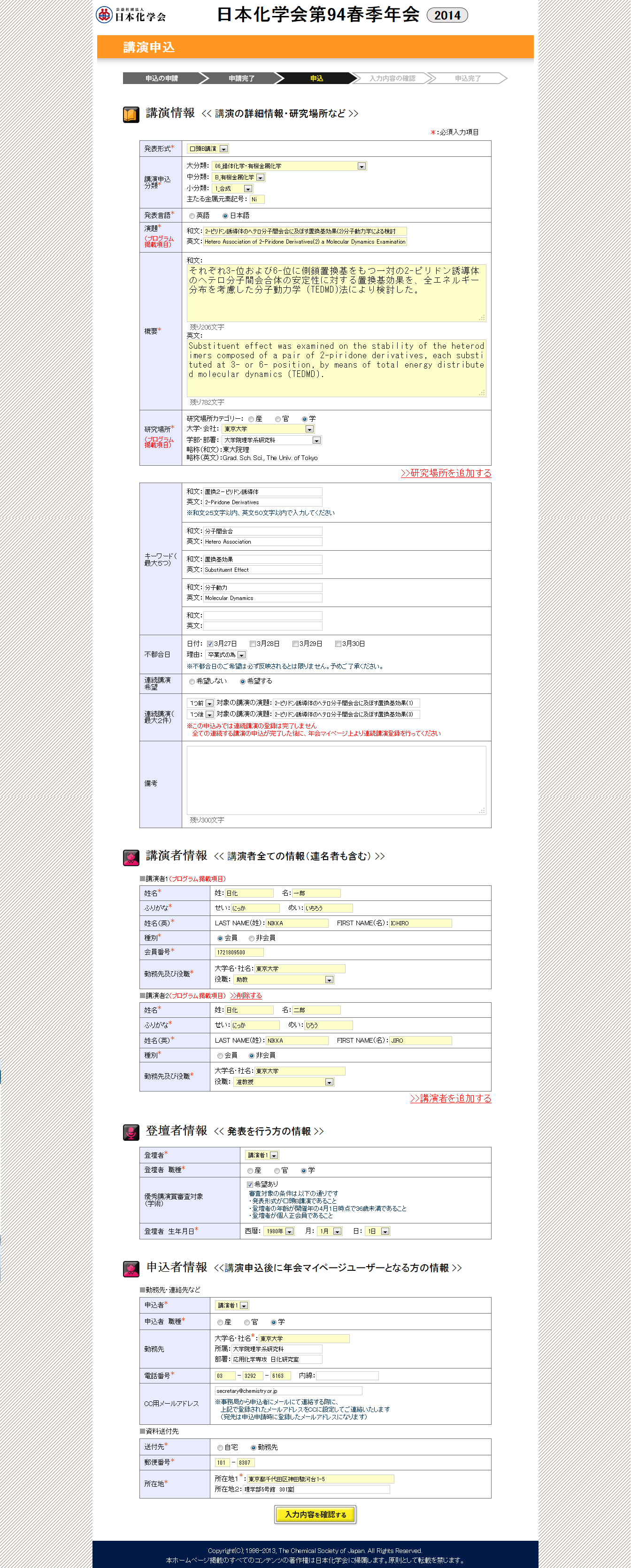 講演概要を和文300字、半角の英数字および記号のみで、英文約150WORD(1000文字以内)に内容をわかりやすく簡潔に入力する。その際、構造の複雑な化合物は、 IUPAC名を用いず「〜誘導体」等のようにわかりやすい一般名を用いるとともに、専門をやや異にする人にもわかりやすいように一般的な用語、平易な表現を用いること。 |