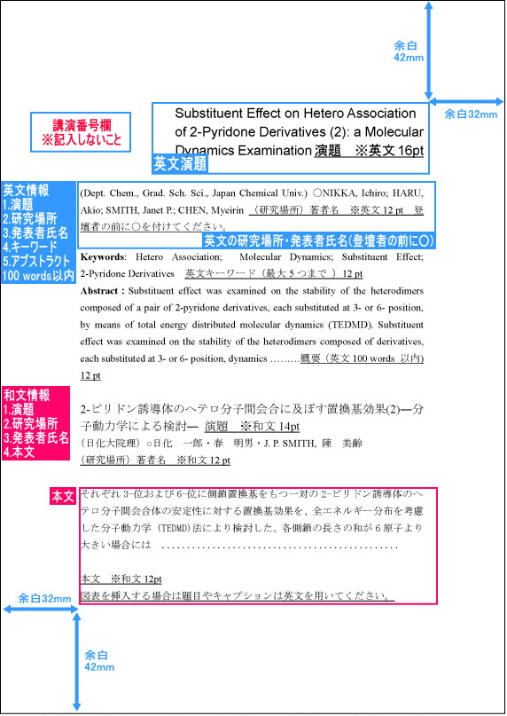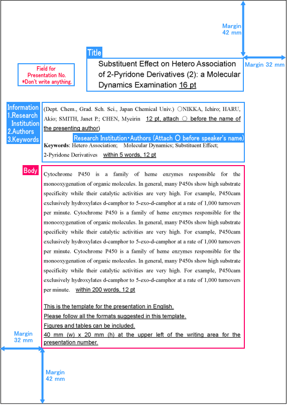 日本語のテンプレートでは英語と日本語の併記を推奨しています。 ただし,1)講演番号欄,2)余白,を確保すれば,その他の有効範囲は自由に記載できます(フォント,行間,英語と日本語の配分を含む)。 日本語での記載量が極端に少ない場合にはご自身で調整してください。