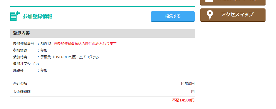 年会マイページトップの参加登録情報にある『参加登録する』ボタンから参加登録ページへと進みます。