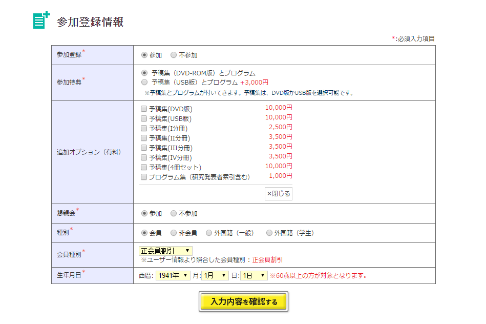 参加特典以外に冊子の予稿集や追加のプログラム集などが必要な場合は、追加オプションを選択する。