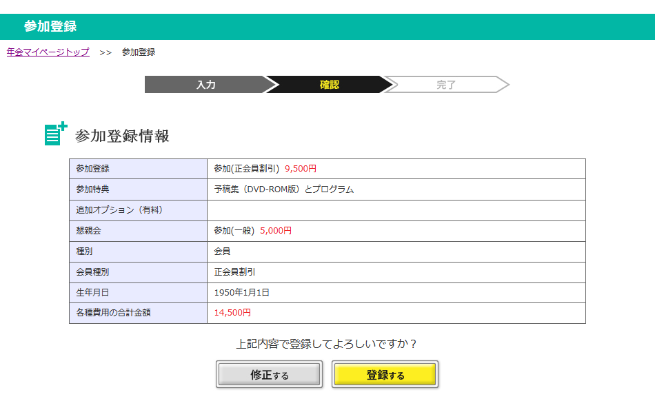 参加登録情報を確認し、『登録する』ボタンをクリックして下さい。