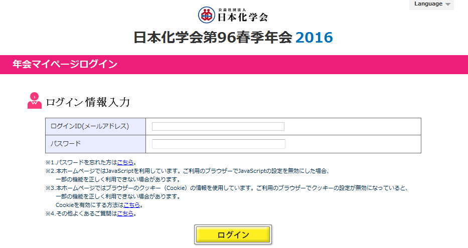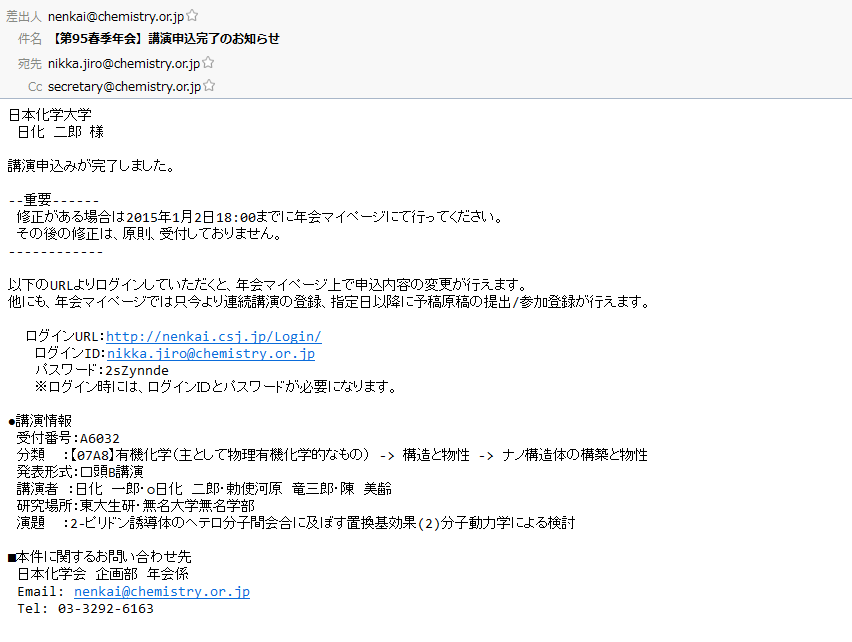 申込が完了すると年会マイページが作成されます。年会マイページにログインするには完了メールに記載されているログインID(E-mail アドレス)とパスワードが必要になります。なお、パスワードの変更は年会マイページログイン後に可能です。