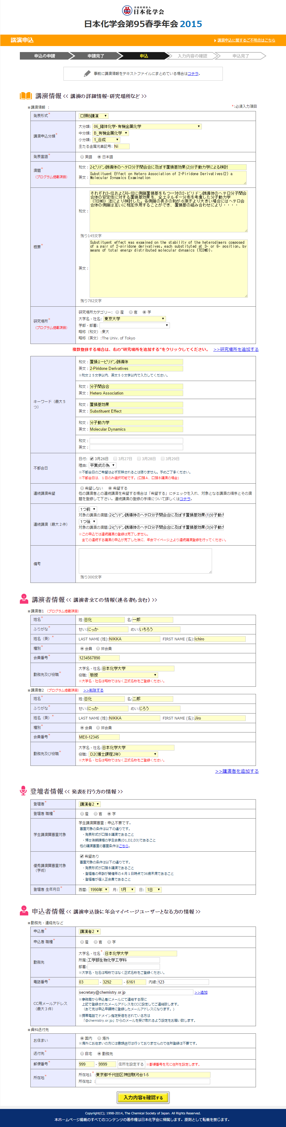 (1)問題なく取り込めた場合講演申込の入力ページにテキストデータが反映されます。他、追加事項がなければ、『入力内容を確認する』ボタンをクリックして下さい。