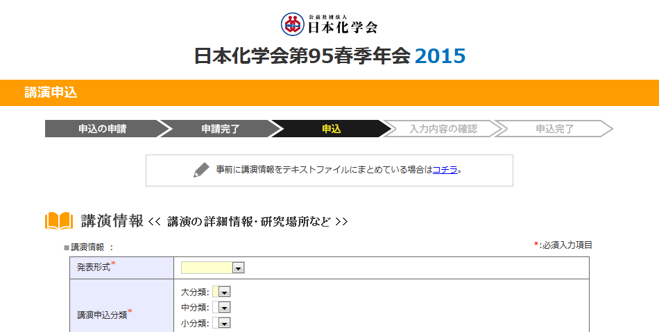 講演情報はテキストデータを使用して自動入力することもできます。「事前に講演情報をテキストファイルにまとめている場合はコチラ」 のリンクからデータを取り込むことができます。
