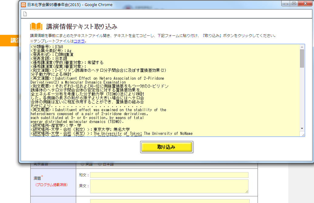 講演情報のテキストファイルを開き、テキストを全てコピーし、開いたポップアップ画面のテキストエリアにコピーしたテキストを貼り付け、『取り込み』ボタンをクリックして下さい。