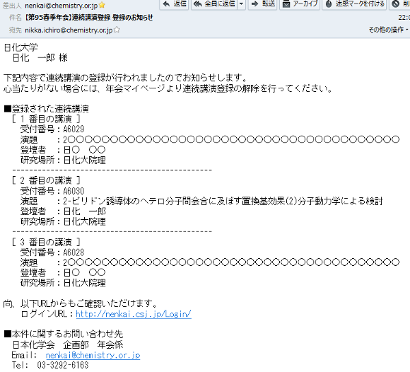 連続講演を希望される方のうち、どなたか1名が登録していただければ他の連続講演の登録も完了致しますので、各々の登録は不要です。