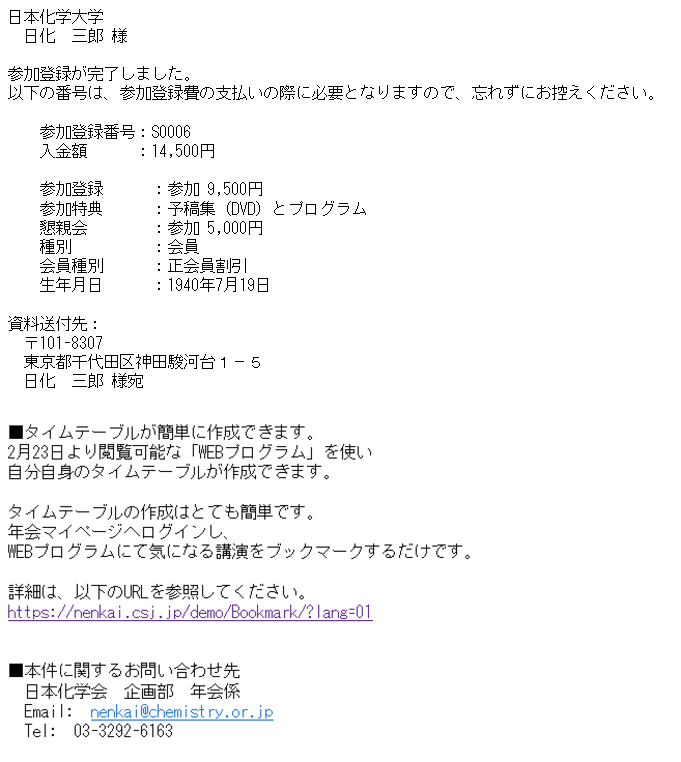 メールが受信されたことを確認して下さい。メールに記載されたURL から参加登録の入力画面へ進みます。