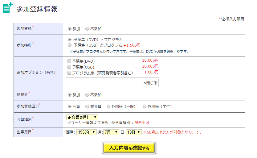 参加登録情報を入力し、『入力内容を確認する』ボタンをクリックして次へ進んで下さい。