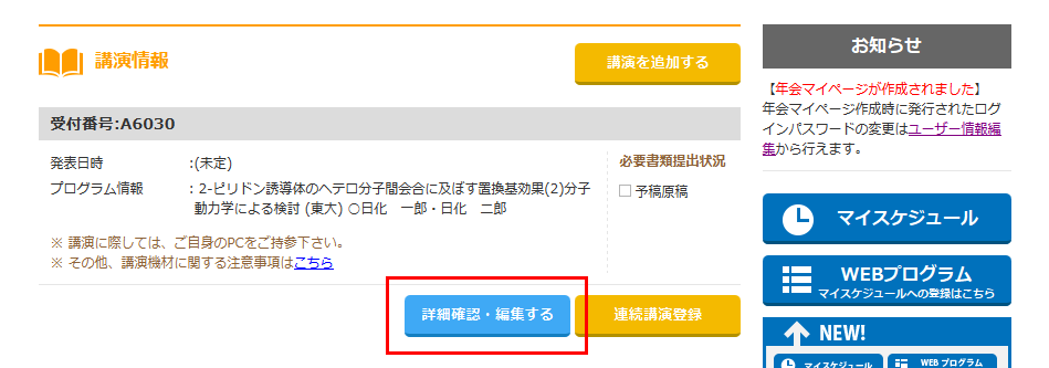 ログイン後に表示される年会マイページトップの講演情報にある『詳細確認・編集する』ボタンから講演情報の詳細を確認することができます。