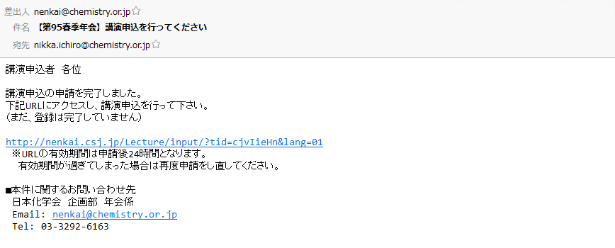 登録されたメールアドレスに講演申込へ進むURL が記載されたメールが送信されます。