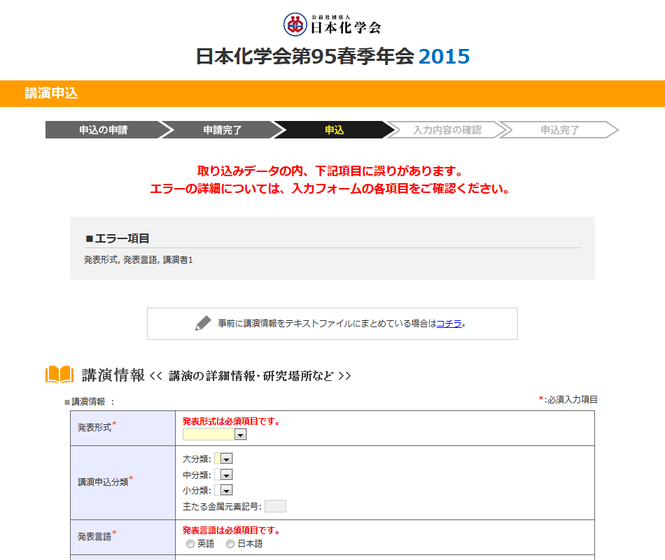 講演情報はテキストデータを使用して自動入力することもできます。「事前に講演情報をテキストファイルにまとめている場合はコチラ」 のリンクからデータを取り込むことができます。