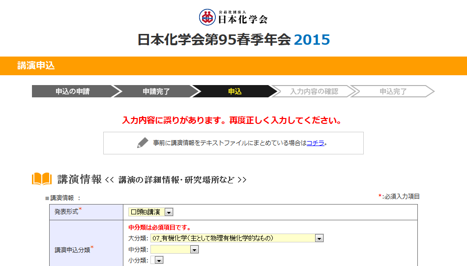 申込に必要な講演情報を入力し、『入力内容を確認する』ボタンをクリックして次へ進んで下さい。