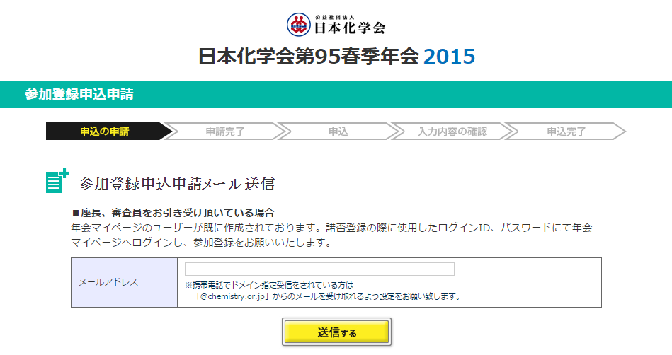 メールアドレスを入力し送信ボタンを押して下さい。入力したメールアドレスは申込完了後に年会マイページのログイン時や事務局からの連絡に使用します。